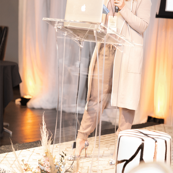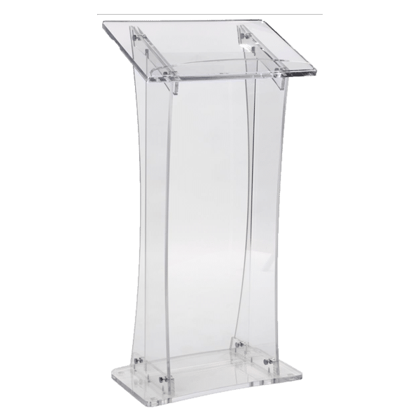 Acrylic clear lectern with half-inch raised edge bookstop. Lectern comes with option for customized vinyl application along front-facing and/or side panels. Custom vinyl application services provided in-house.