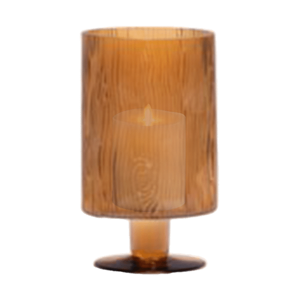 Amber glass hurricane with faux bois detail adds a touch of the natural world.