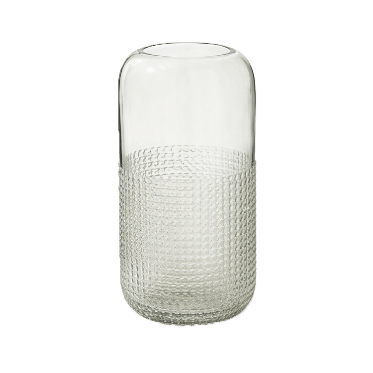 This textured glass cylinder balances clarity and pattern, anchoring florals in modern, refined, or softly architectural event designs.