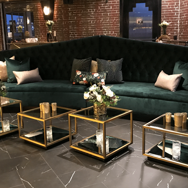 This stunning emerald velvet sofa features a high, angular button-tufted back and rounded seat, paired with simple metal legs that come in gold and silver. Full assembly showcases a triangular-shaped back and reaches 16 feet in length.