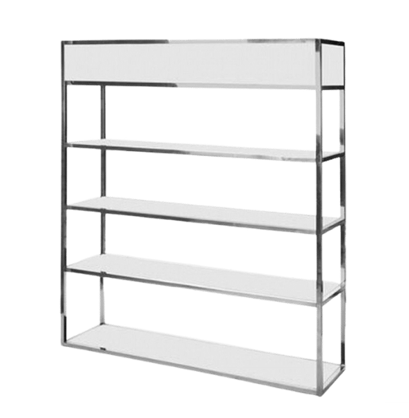There is nothing that Hayes can’t handle. Sleek silver steel frame and crisp white shelving lets Hayes blend in with any decor theme. Add custom branding or graphics to the top enclosure or any of the shleves to customize the look. Top box can glow with LED lighting. Use independently for a display or pair with our Aura bar for a beautiful set.