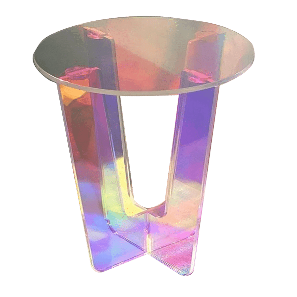 This graceful acrylic table gets a pop of spunk with the vivid iridescent finish. Bring in this table for any decades, disco, or iridescent themed event.