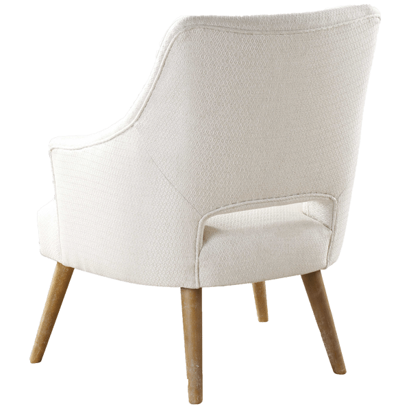 Retro style accent chair showcases a subtle ivory and sand texture with washed golden oak tapered legs.