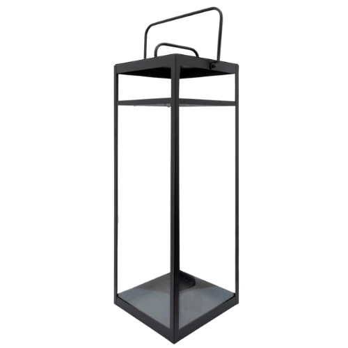 Sleek black metal lantern with glass panes adds a clean look.