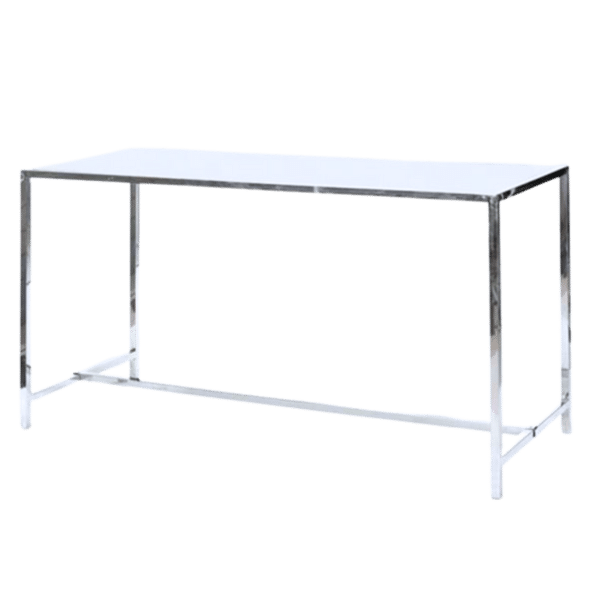 Sleek polished silver bar height tables create unique dining spaces for guests to gather. Print vibrant, custom graphics to fully wrap the top of this community table to create a clean and impactful look. Pair with Luna Barstools to seat up to 8 guests.