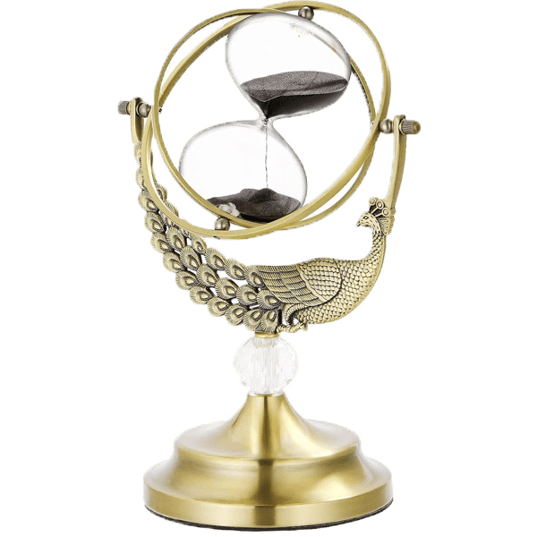 This elegant globe hourglass with black sand and peacock detailing adds a touch of intrigue to your decor.