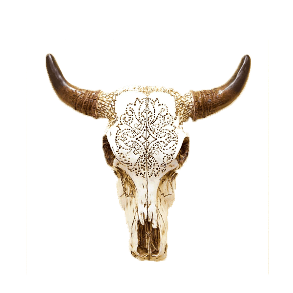 Faux steer skull with intricate tribal engraving. Add to any southwest, desert, or boho style event.