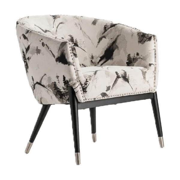 This classic barrel chair brings a subtle touch of the mountains with an abstract black and white landscape print. Weston is finished with nailhead detail and brass tipped legs.