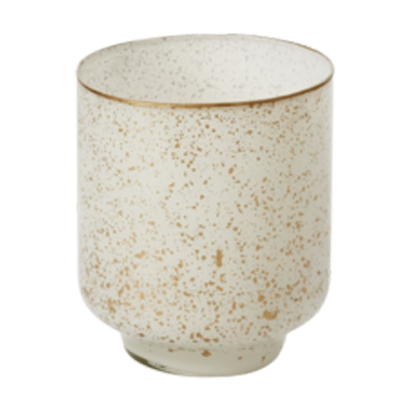 These white glass votives enjoy a soft gold fleck throughout topped with gold rim. Candlelight shines beautifully through this softly sheer votive.